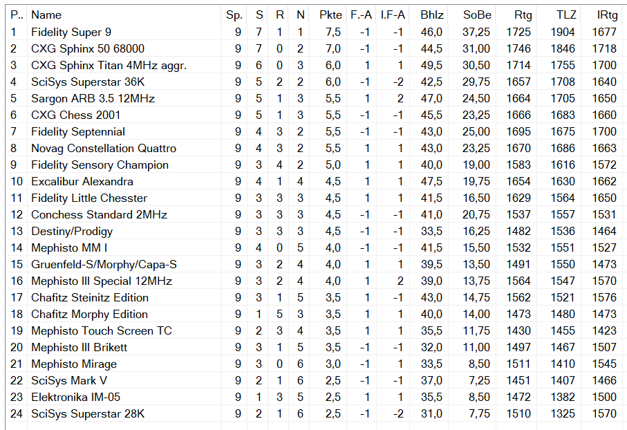 Fidelity Super 9 - im Turnier als Version Sensory Champion mit Super 9 Upgrade von Fidelity - hatte nach 7 Runden 100% Punktausbeute. Erst in den letzten beiden Runden musste er Federn lassen, doch Platz 1 wurde gehalten. Ein schöner und wichtiger Sieg war in Runde 4 gegen das getunte 16K-Danielsen-Programm,