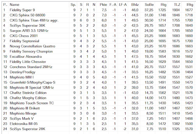 Apropos CXG, selten genug sieht man die Schachcomputer dieser Marke um einen Turniersieg mitspielen, aber in diesem U1700 waren es direkt drei Stück die permanent oben in der Tabelle rangierten. Am Ende landeten sogar alle auf den Aufstiegsplätzen. Insbesondere die